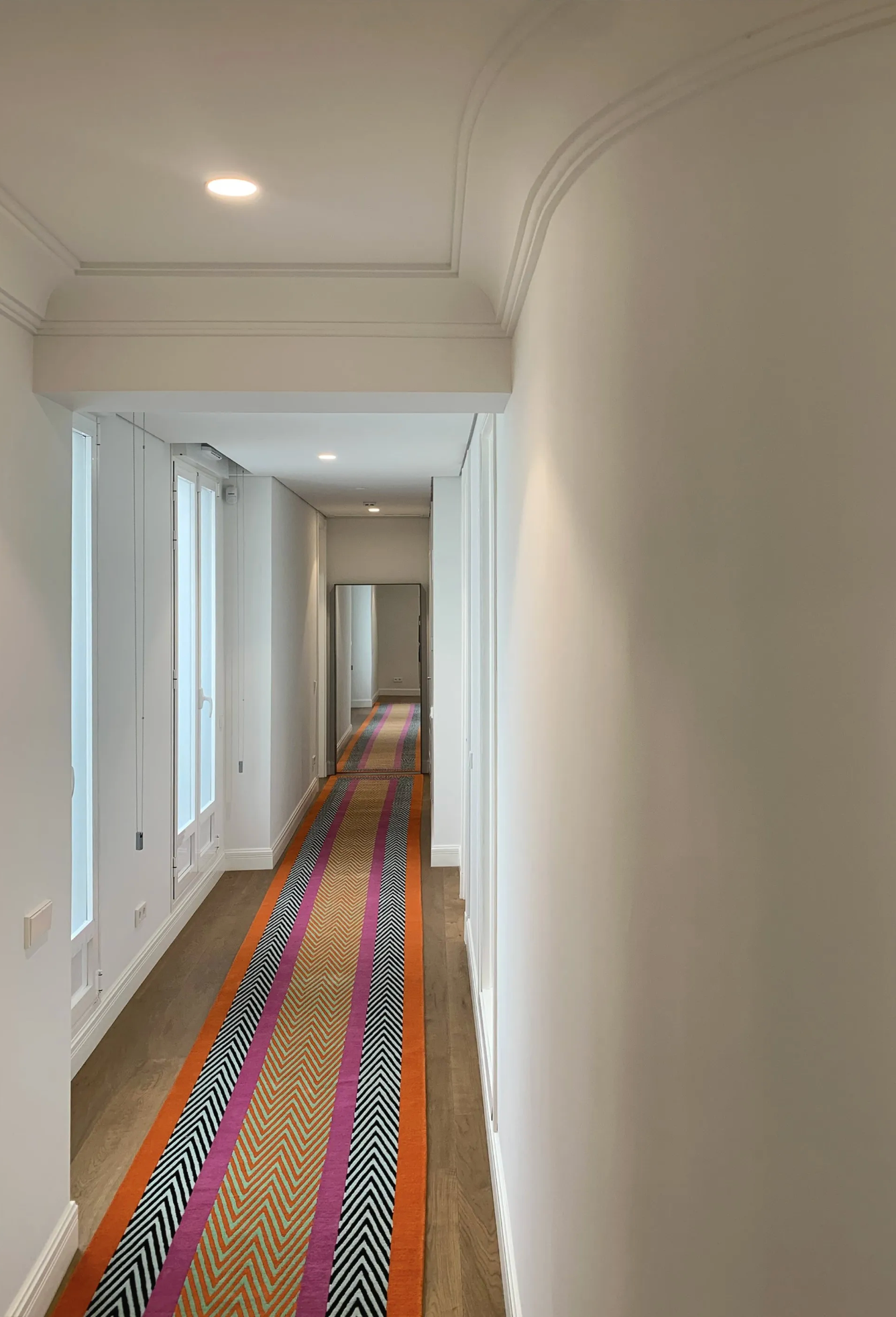 Un pequeño hall divide el ala privada de la pública. Después, el pasillo con vistas al patio interior del edificio, es el encargado de conducirnos a cualquiera de las tres habitaciones en suite.