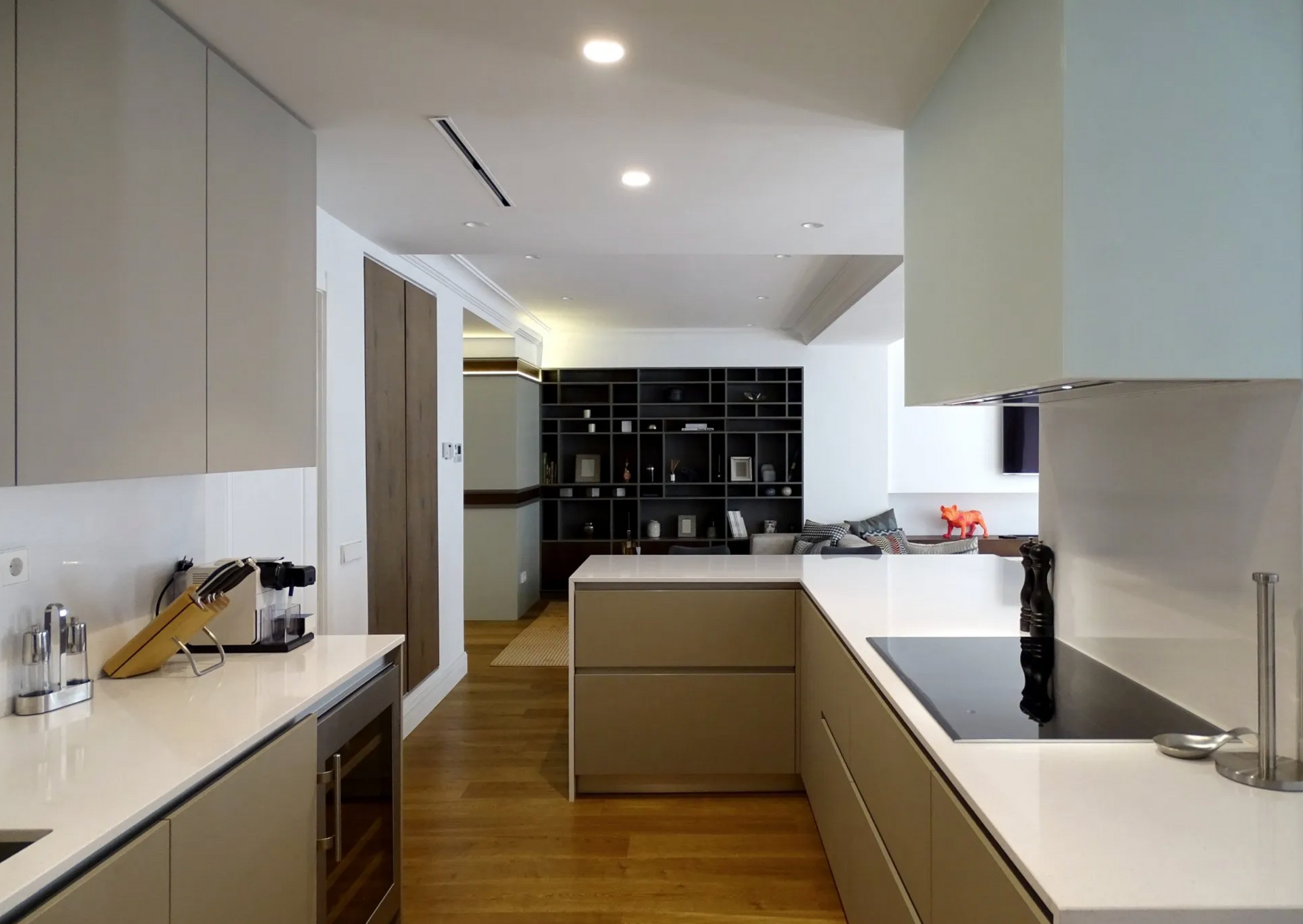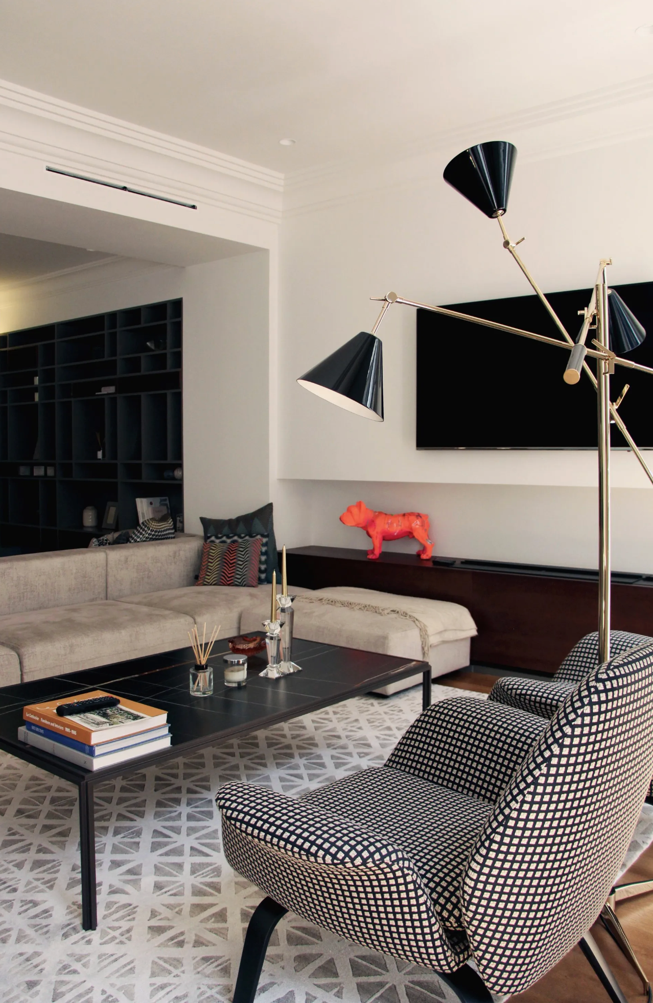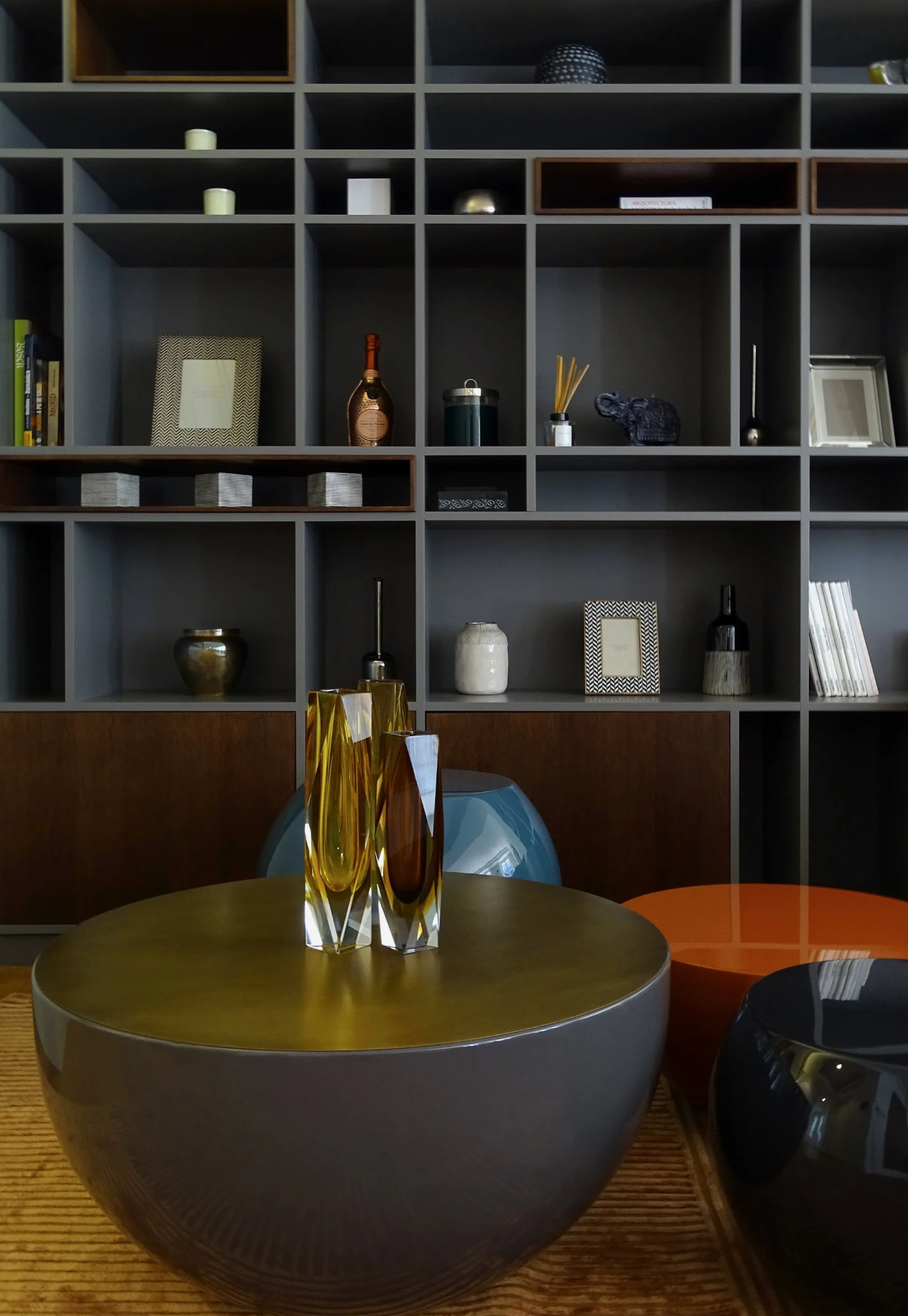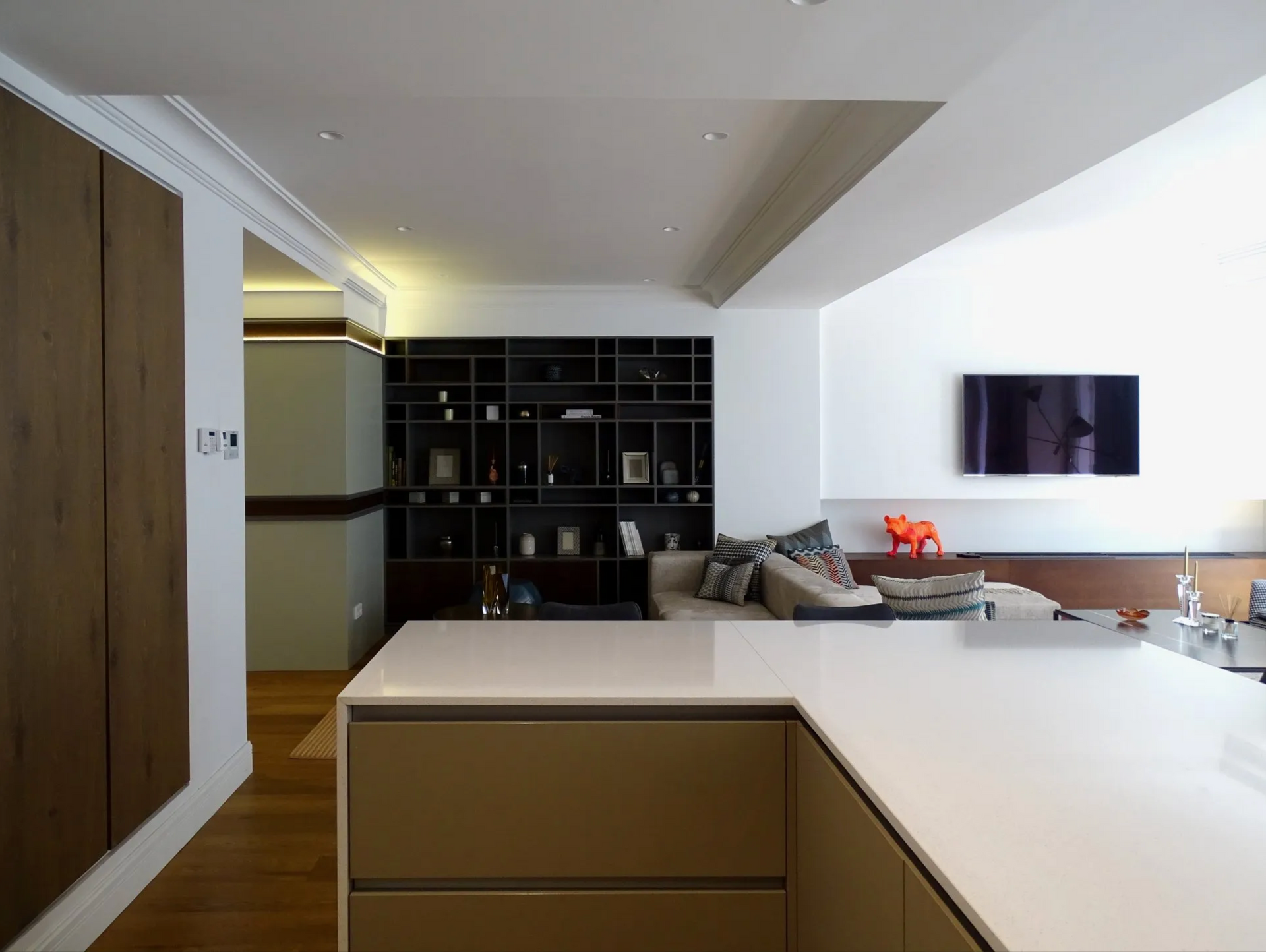 El acceso principal a la vivienda tiene lugar en un gran espacio abierto que integra la cocina, el comedor y dos salones, uno orientado en torno a la televisión y otro situado junto a una elegante biblioteca diseñada a medida.