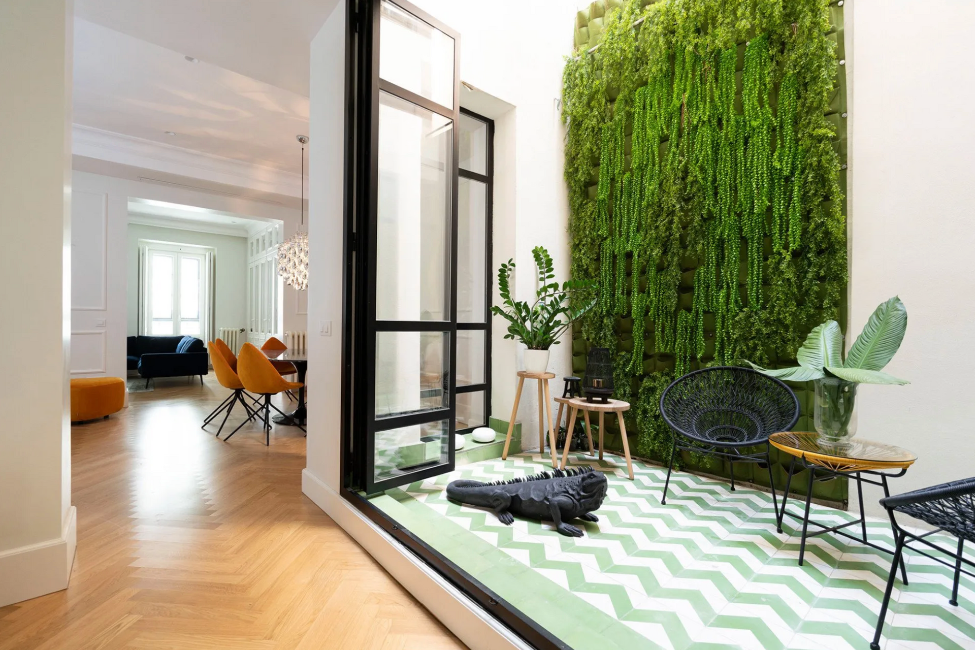 Para ello, decidimos que este espació de intersección, albergase la cocina y un gran patio central cuyo jardín vertical actúa como núcleo verde de toda la vivienda.