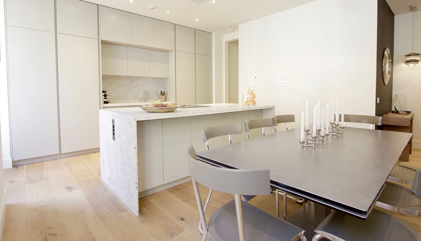 La cocina americana hace que el espacio se integre perfectamente y hace de este espacio un lugar agradable para compartir con amigos.