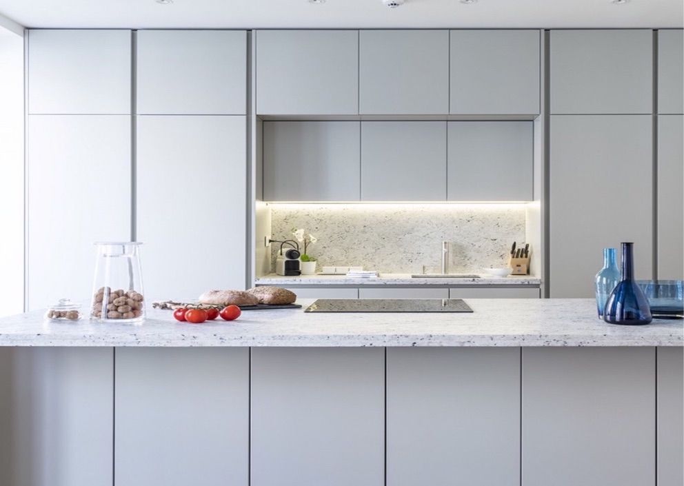 Es un espacio amplio y luminoso con materiales naturales como madera y marmol. Asi mantenemos un estilo elegante donde predomina el color gris con detalles y texturas en madera, gris y azul.