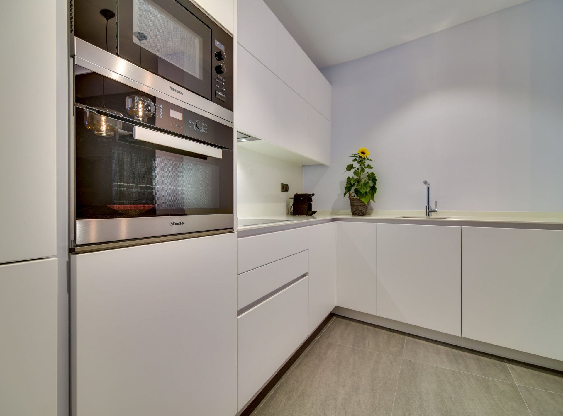 Al entrar al piso nos encontramos con un comedor y salon integrados junto a una cocina vista. Los matariales naturales del suelo y marmol negro en la encimera de la cocina son ideales.