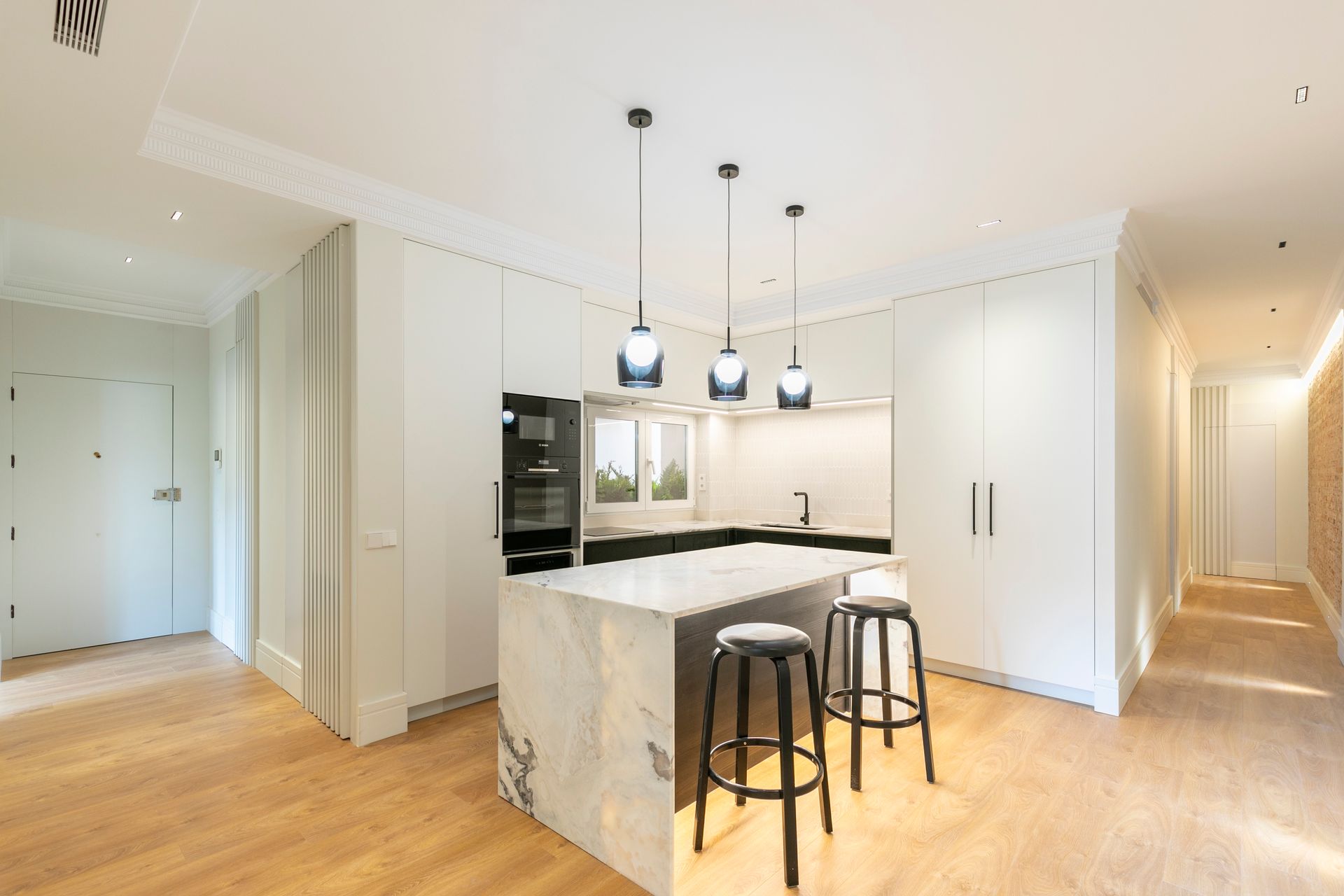 Llevamos a cabo un proyecto integral de arquitectura, interiorismo y construcción en esta vivienda de la Calle General Díaz Porlier, creando un hogar listo para ser disfrutado. Cada espacio ha sido diseñado con precisión, optimizando la distribución, la luz y el confort. Materiales y acabados seleccionados con esmero dan forma a una atmósfera de sofisticación y armonía. Esta reforma llave en mano revaloriza la propiedad, combinando modernidad y calidez en una de las ubicaciones más privilegiadas de Madrid.