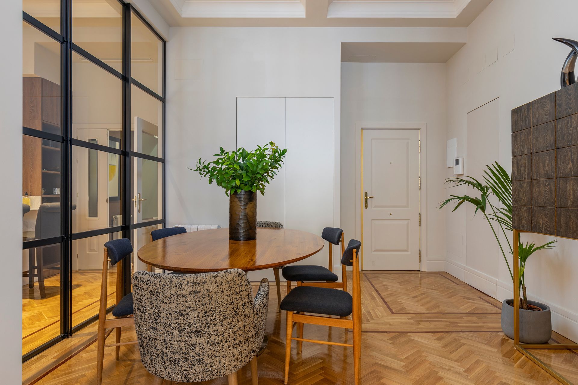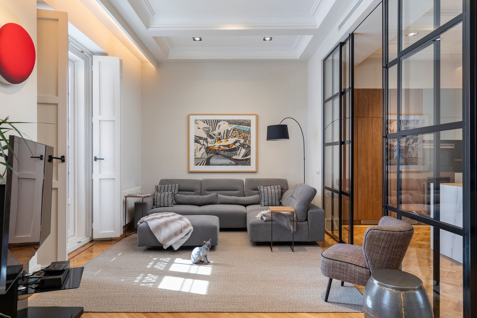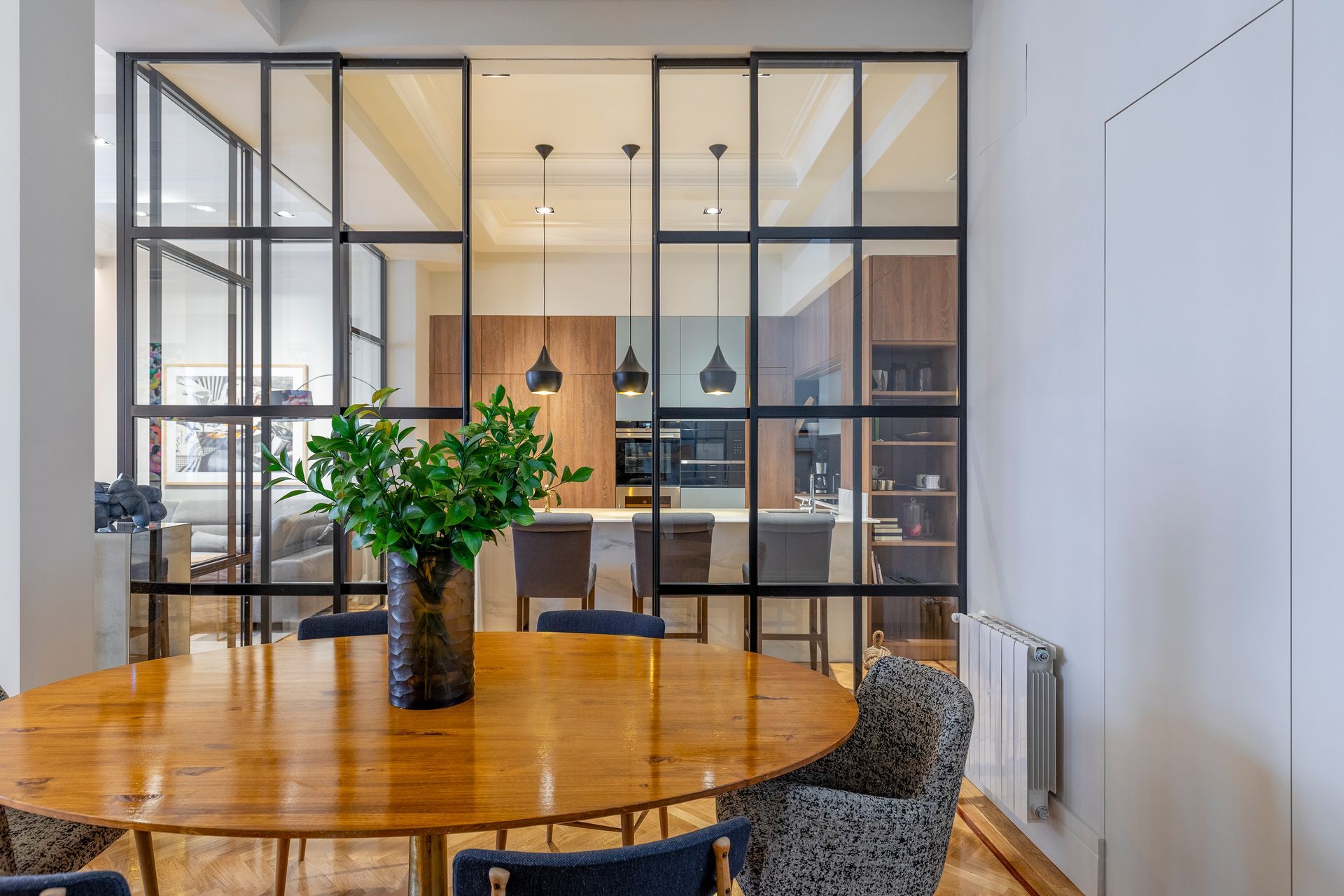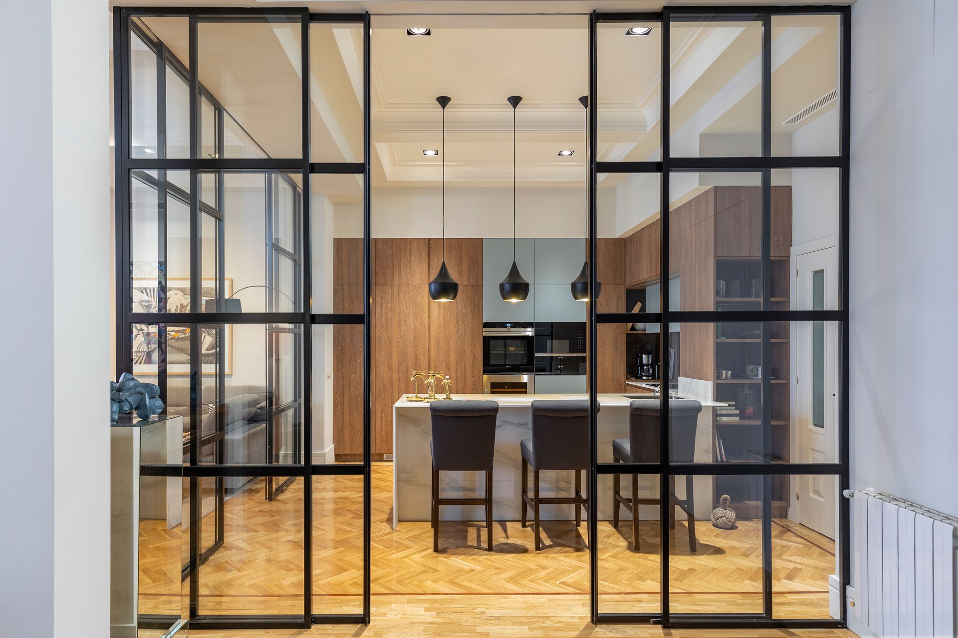 En este proyecto unimos dos viviendas y logramos ampliar los espacios comunes. La cocina se integra perfectamente al salón y comedor pero a la vez tiene la posibilidad de cerrar este espacio con unas puertas corredizas de cristal con perfiles negros en acero, esto es muy funcional a la hora de cocinar y tener visitas.