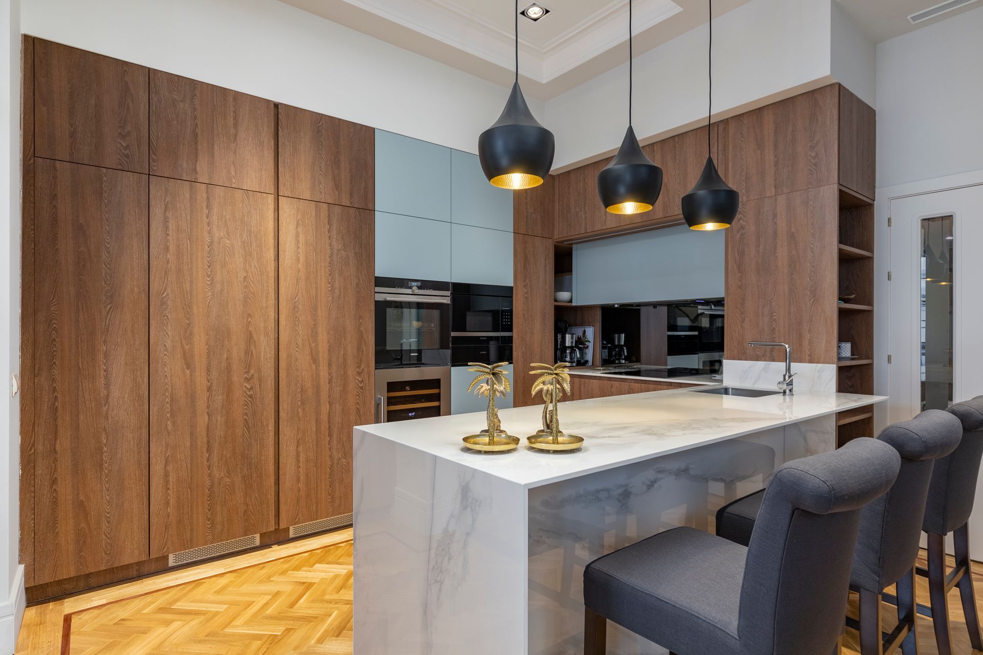 La cocina es muy especial. Combinamos materiales nobles y naturales como mármol y madera. El frente de la cocina tiene detalles en azul menta y es la combinación perfecta de colores fríos y calidos.