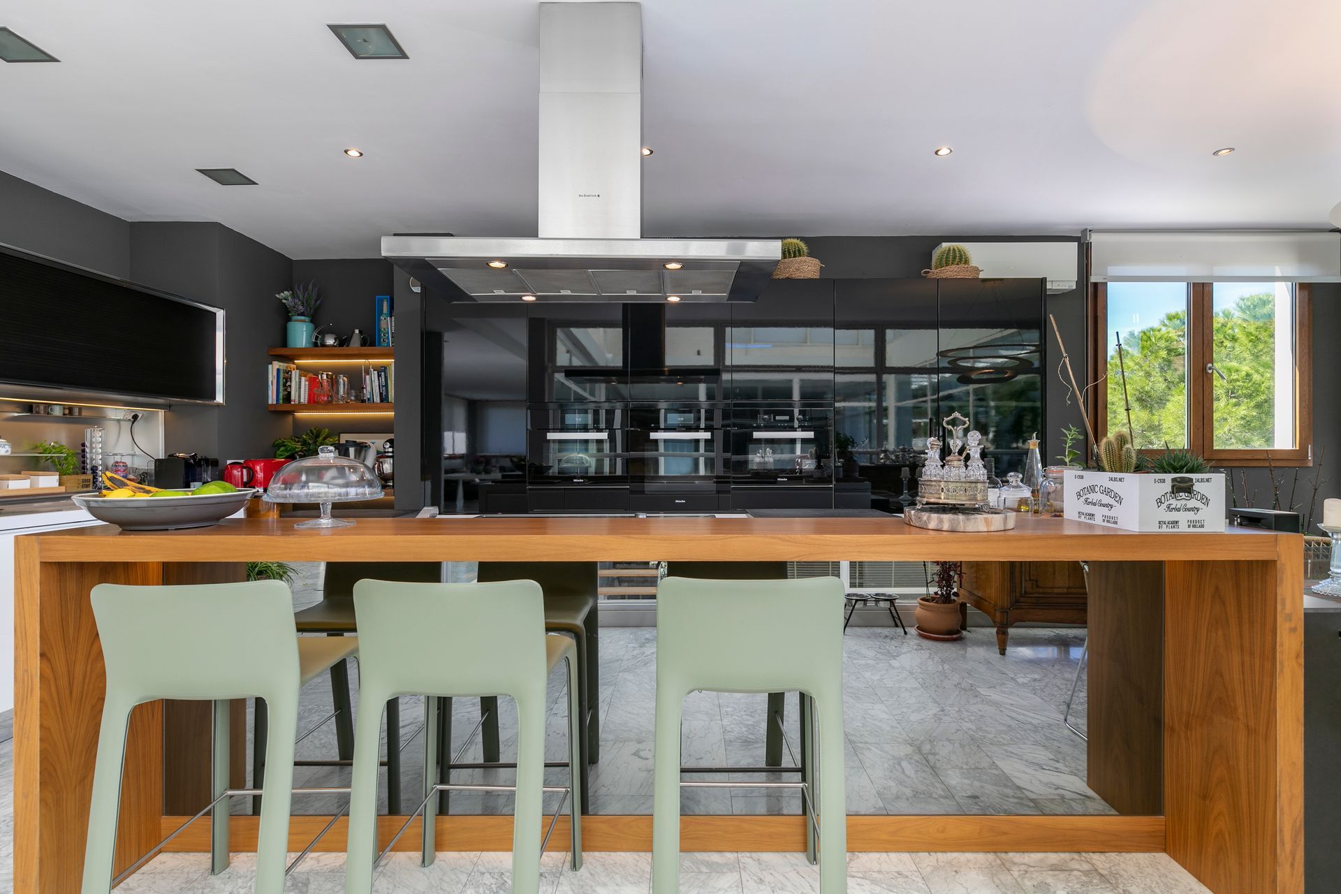 La cocina tipo americana abierta combina tanto tonos de madera, muebles lacados en negro y blanco. Está decorada con elementos coloridos. El salón se encuentra en esta misma planta, al otro extremo del patio interior.